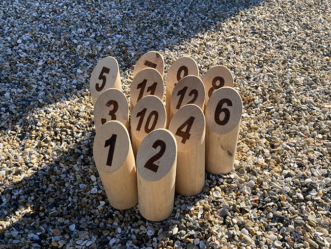 モルックは、木製の棒(モルック)を12本の木製ピン(スキットル)に向かって投げるゲームです。