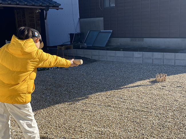 最初は投げるタイミングや方向が思ったより難しく、なかなか当てることができず悔しい思いをしました。 でもその分、1本倒れたときの喜びが大きく、だんだんコツをつかむと一気に盛り上がります。